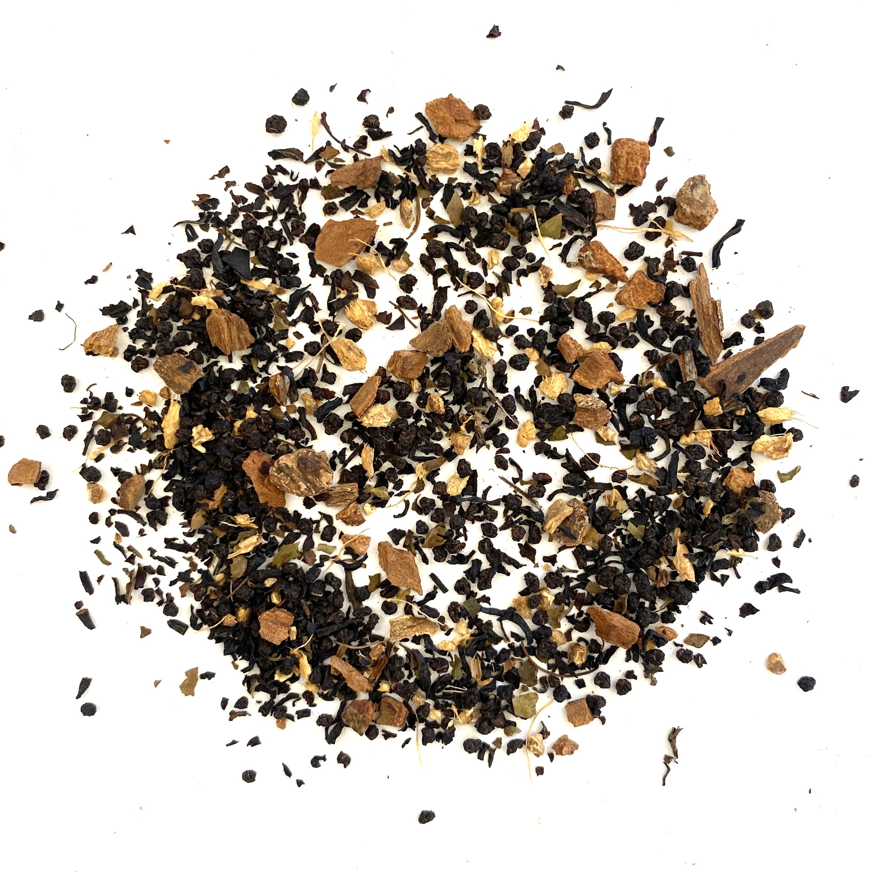Black Tea Chai Blend with Tulsi Leaf, Ginger Root, Cinnamon Chips, with Natural & Artificial flavors
