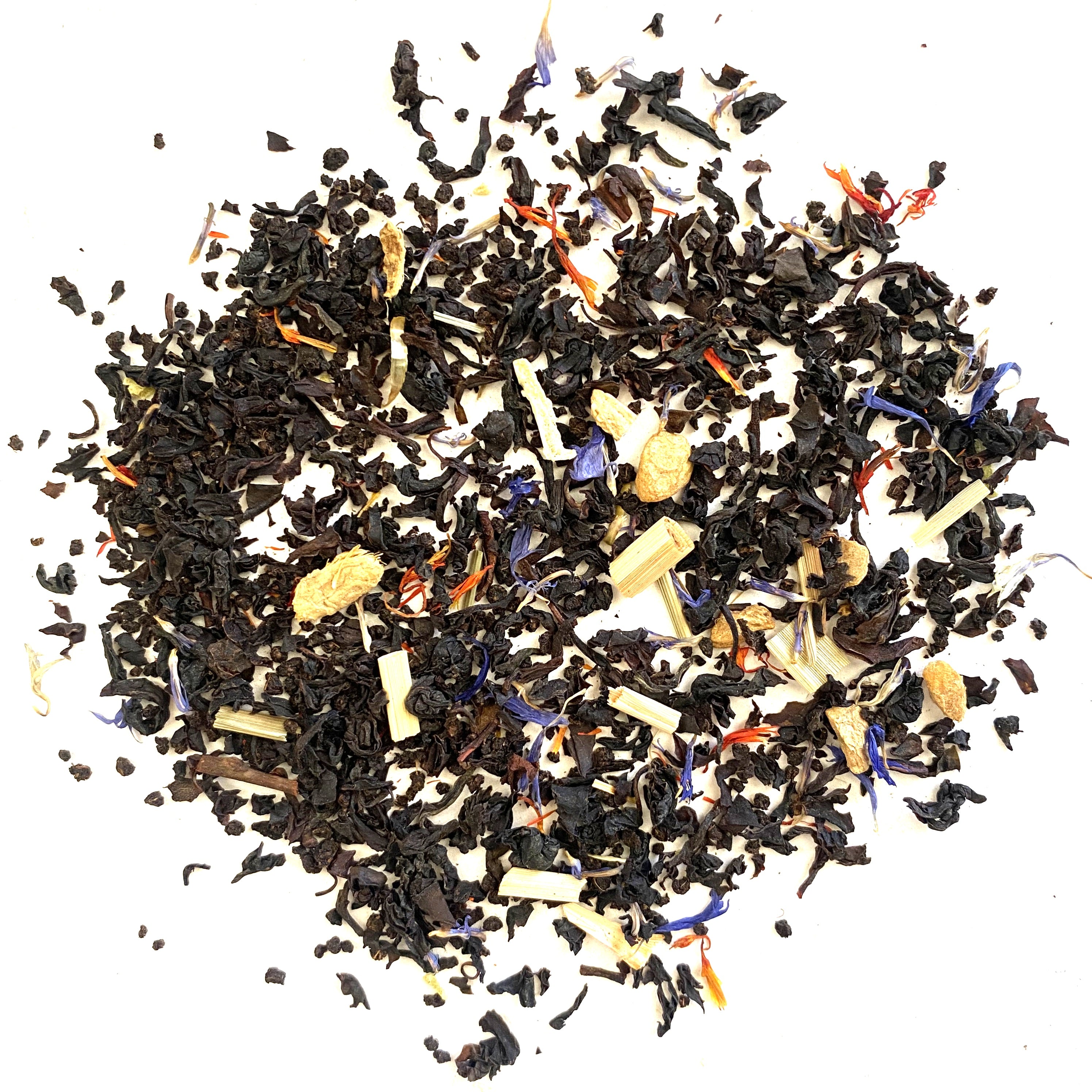 Flavored Assam Black Tea with Safflowers, Pineapple, Ginger, Shredded Coconut, Lemon Grass, Cornflowers, with Ginger/Lemon/Pina Colada natural and artificial flavoring.