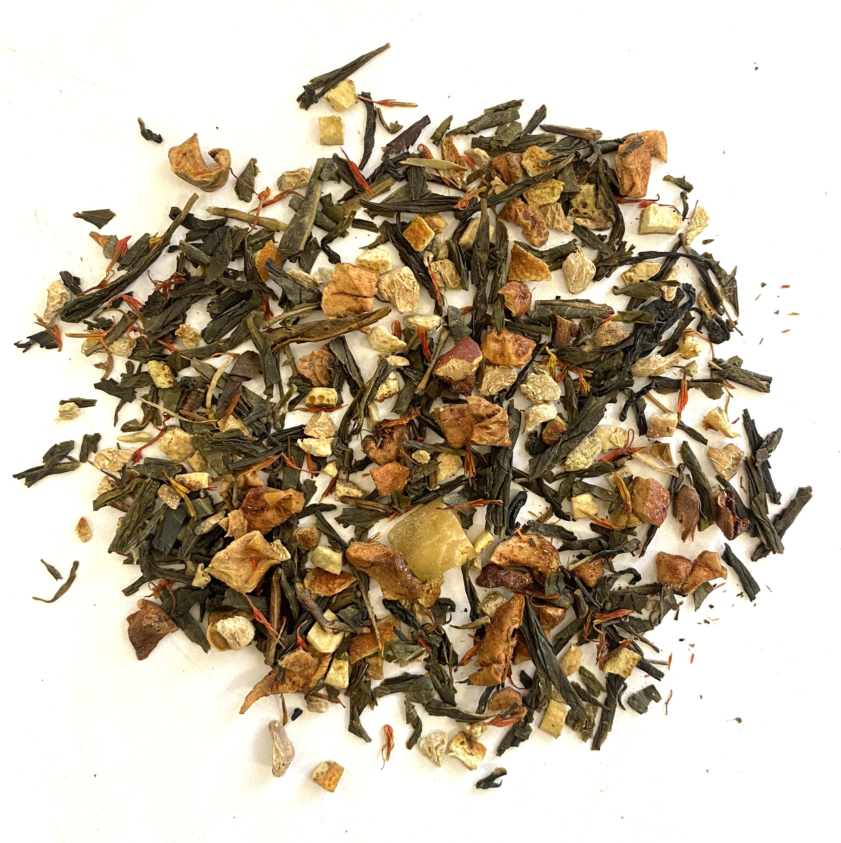 Green Tea with Orange Peel, Ginger Root, Apple pieces, Safflower, Mango pieces, and Natural flavors