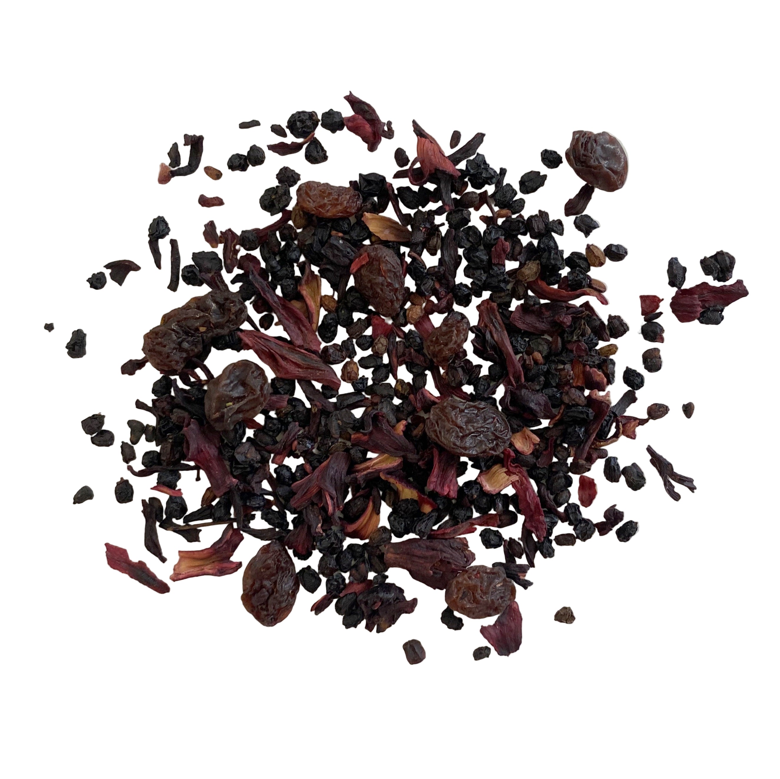 Elderberries, Raisins, Hibiscus, Blackberries, Raspberry, Sour Cherry, Blackcurrants, Blueberries, flavoring.