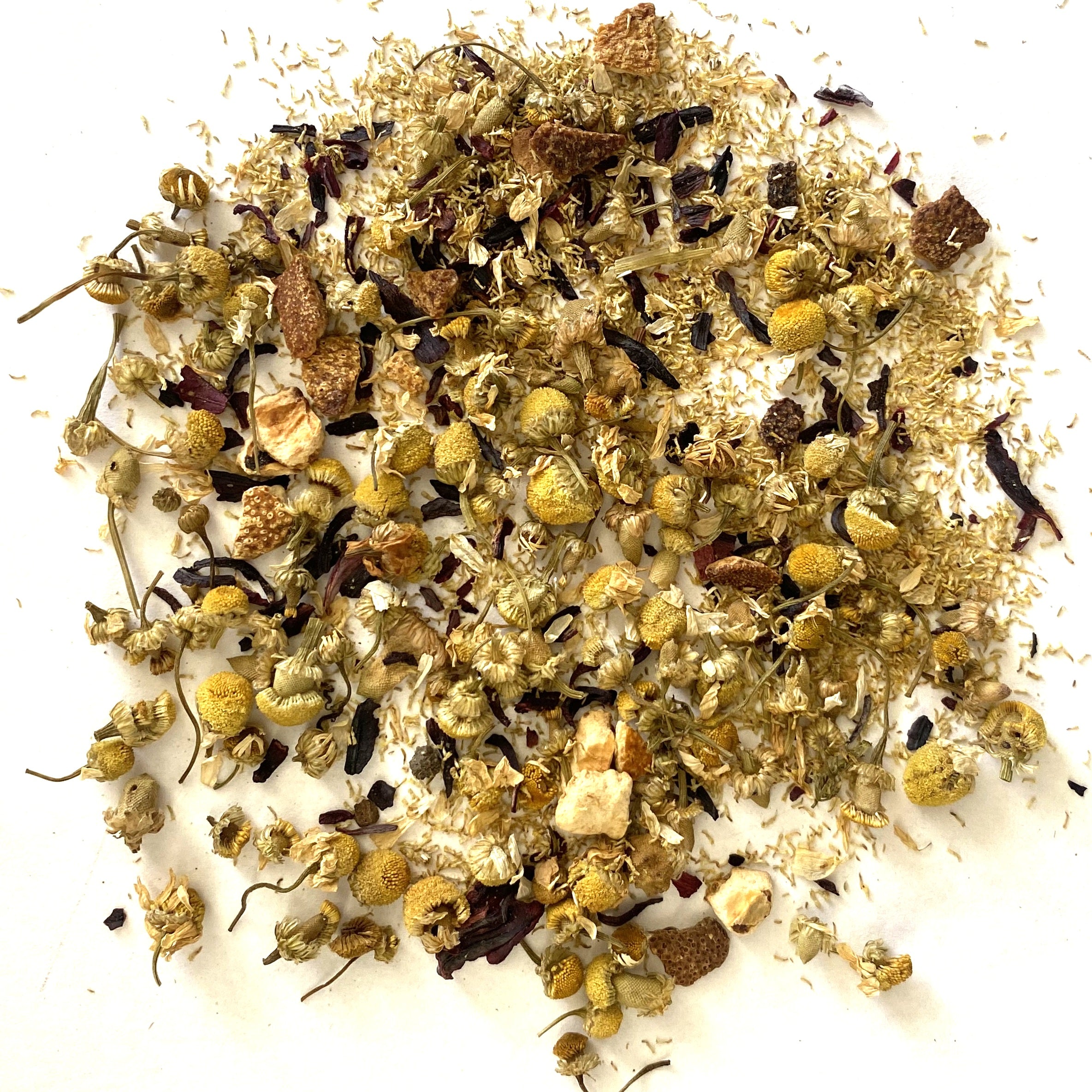 Blend of Chamomile Flowers Orange Peel, and Hibiscus, with Natural & Artificial Flavoring.
