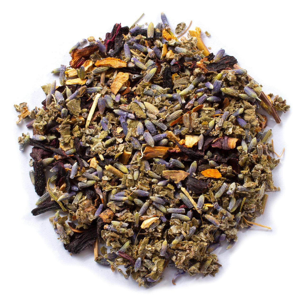 Hibiscus with Lemon Peel, Lavender Flowers, and Raspberry Leaves, with Natural & Artificial Flavoring.