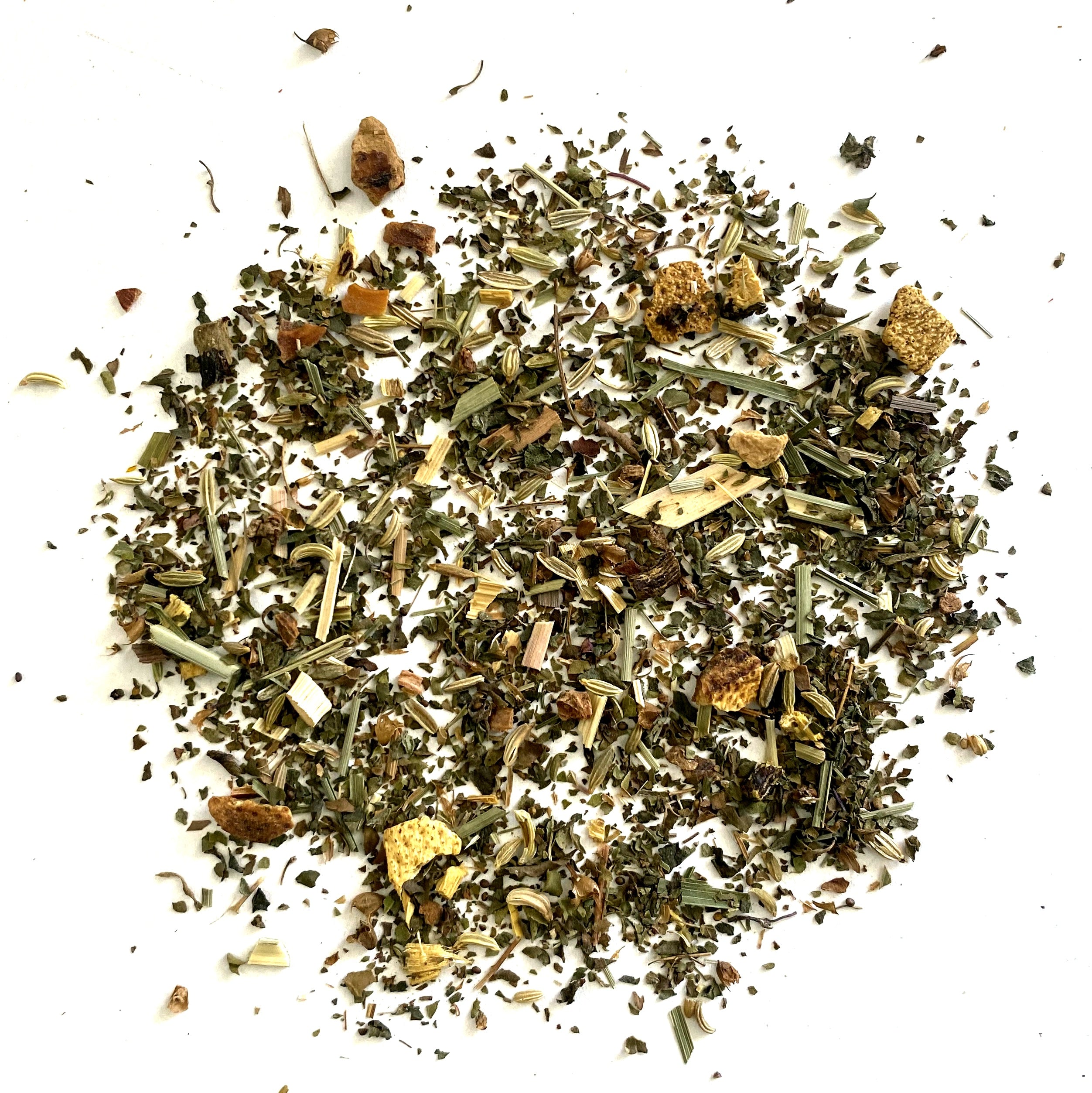 Holy Basil, Fennel Seed, Lemon Grass, Licorice root, Star Anise, Orange Peel, Peppermint, with Natural & Artificial Flavors.